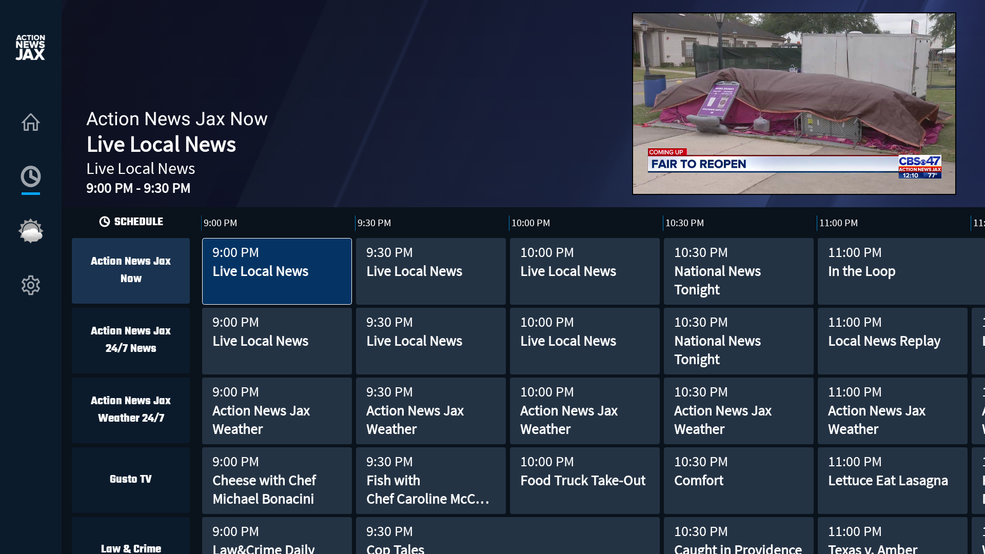 I was the lead developer in creating and implementing an Electronic Program Guide (EPG) for the Fire TV & Google TV news app while working for Cox Media Group. This news app contains 8 different build variants to account for the 8 different news channels. The EPG is scalable and is built to adjust based on the Json configuration file for the given build variant. Pictures below will capture exhibit each build variant displaying different content within the EPG.