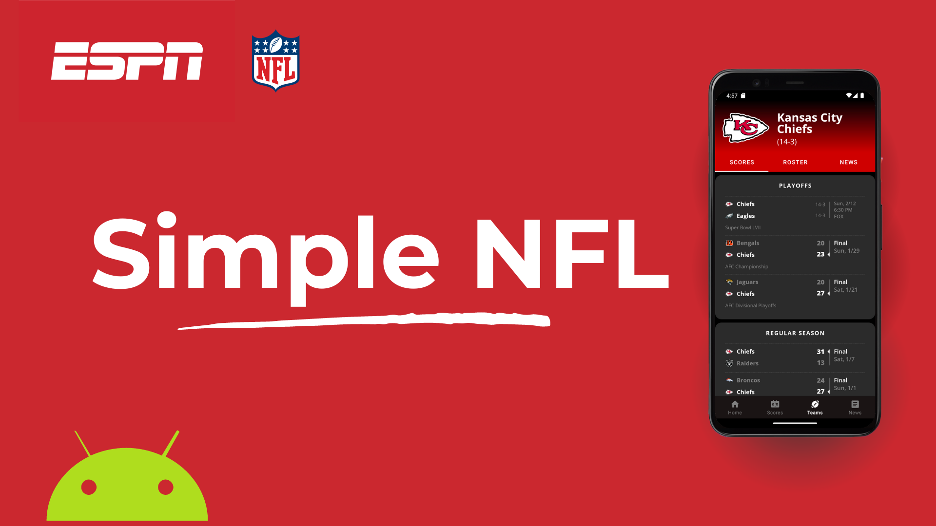 SimpleNFL is a Kotlin app utilizing the ESPN API to provide league news, scores, and rosters.